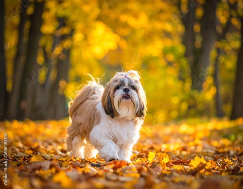dog, shih tzu, autumn, leaf, park, fall, gold, light, sunlight, happy, cute, pet, adorable, walking, playful, nature, forest, tree, yellow, orange, brown, white, fluffy, pretty, bright, image, animal, mammal