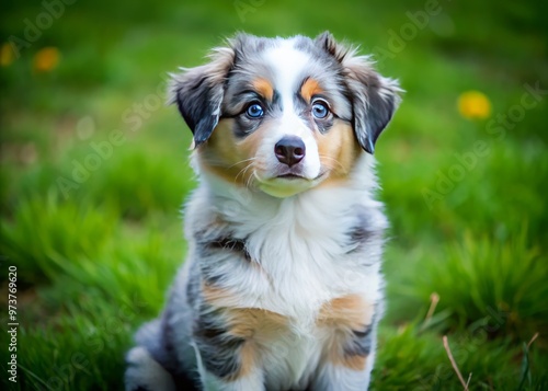 Adorable small Australian Shepherd puppy with blue merle coat and piercing brown eyes sits on green grass, looking
