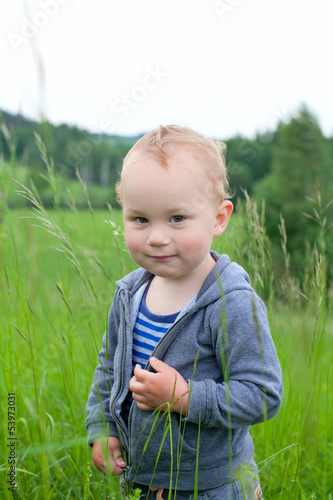 adorable smiling toddler in high summer grass