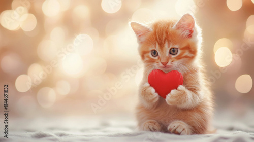 Adorable tabby kitten holding a red heart on a glittery surface with a bokeh background, symbolizing love and affection. Valentines day