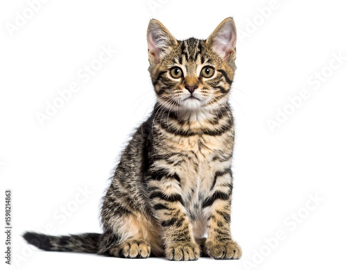 Adorable Tabby Kitten Posing Against White Background Sitting Young Feline Soft Fur Striking Eyes Cute Pet Domestic Cat Small Mammal CloseUp Portrait Wildlife Photography Animal Image