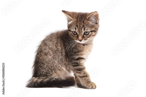 Adorable tabby kitten sitting and looking down thoughtfully against a white background, highlighting its soft fur and striped pattern. Ideal for pet-related content