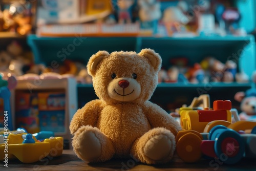 Adorable teddy bear seated among colorful toys in a playful environment, capturing the essence of childhood wonder and nostalgia for joyful moments of playtime fun.