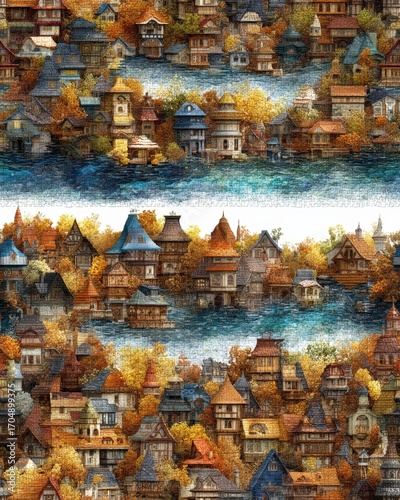 adorable tiny village Colorful Autumn Village with Rustic Houses and Vibrant Foliage in a Scenic Mountain Setting a tiny village on a cloud