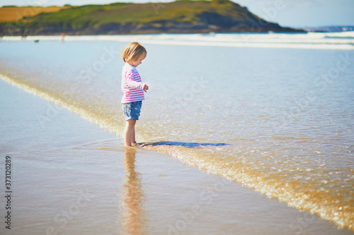 Adorable toddler girl on the sand beach at Atlantic coast of Brittany, France