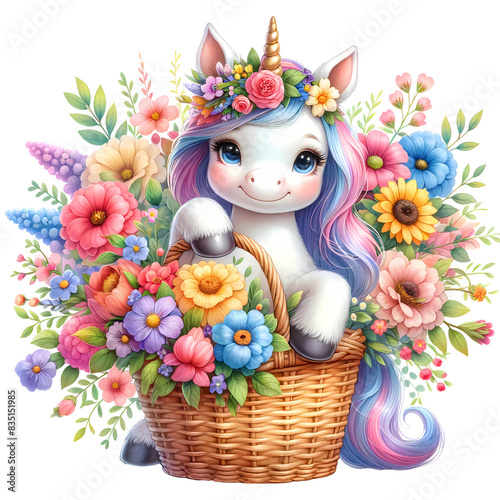 Adorable unicorn sitting in a flower basket adorned with colorful blooms, perfect for fantasy and playful designs.