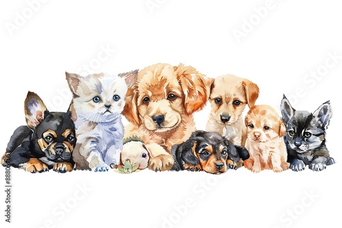 Adorable watercolor painting of a group of puppies and kittens.