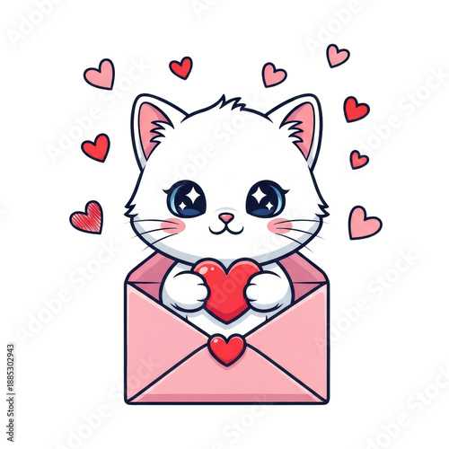adorable white chibi kitten with blue eyes holds a red heart, peeking from a pink love letter envelope, surrounded by doodle hearts on a transparent background. concept of heartfelt kawaii affection