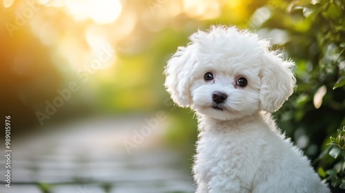 Adorable white poodle puppy sitting on a pathway in a sunlit garden, looking at the camera with a curious expression.