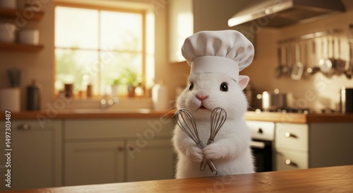 Adorable White Rabbit Chef in Kitchen Holding Whisks Cooking Concept