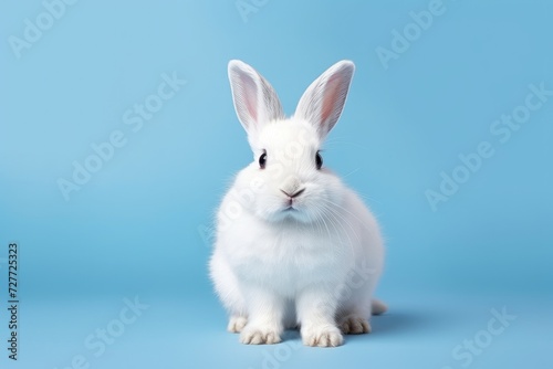 Adorable White Rabbit with Fluffy Fur Against Blue Backdrop - Generative AI