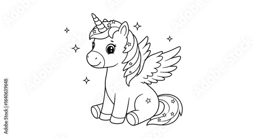 Adorable Winged Unicorn: Line Art Coloring Page Magical Creature Whimsical Stars.