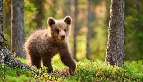 Adorable Young Brown Bear Cub Exploring a Lush Forest at Sunset, Capturing the Enchanting Wilderness of Nature in Early Autumn.