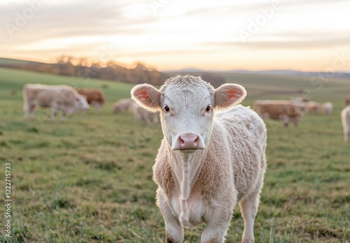 Adorable Young Calf with Soft Fur Stands in a Serene Pasture at Sunset, Surrounded by Rolling Hills and Grazing Cows, Captured in Golden Light