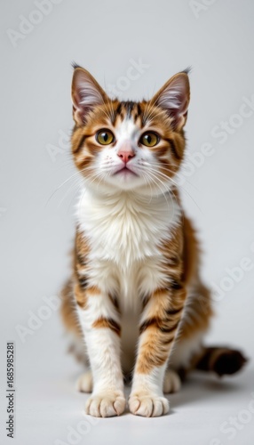 Adorable young domestic cat with striking orange and white fur, large alert eyes, upright ears, and a curious expression, sitting on a plain light gray background