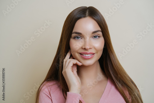 Adorable young female model smiles pleasantly, has long dark hair, looks directly at camera with satisfied expression, has perfect clean skin, wears rosy jumper, isolated over beige background