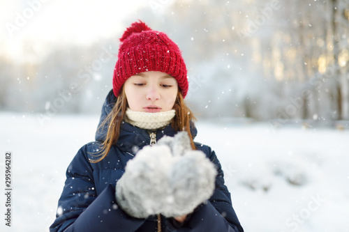 Adorable young girl having fun in beautiful winter park. Cute child playing in a snow. Winter activities for family with kids.