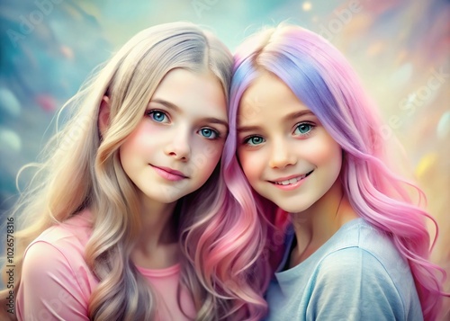 Adorable Young Sisters with Pastel Hair: Capturing Childhood Innocence and Whimsical Style in a Digital Portrait for Family and Childhood Photography