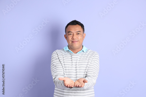 person, portrait, man, asian, 40s, male, isolated, adult, background, smart, studio, standing, casual attire, chinese, colours, blue, purple, hand, point, choice, compare, happy, showing, choose, copy space, empty, balance, comparison, hold, advertising, presenting, equal, palm, show, front, give, share
