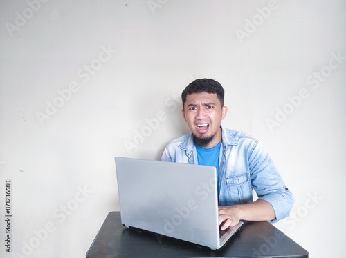 Adult Asian man sitting in front of his laptop showing shocked face expression