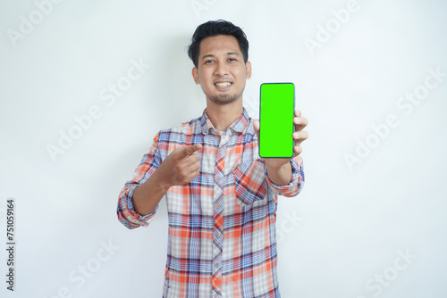 Adult Asian man smiling happy while showing green mobile phone screen and pointing on it