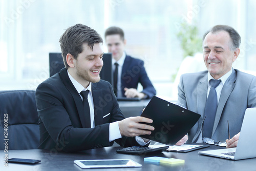 adult businessman discussing financial documents with a young colleague.