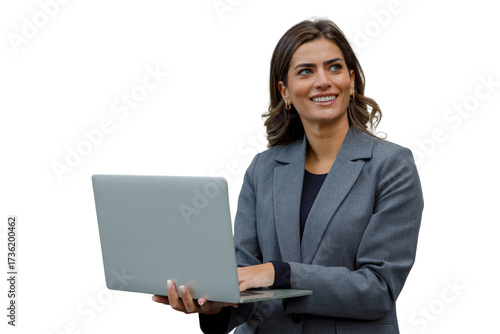 businesswoman, person, business, people, woman, businessperson, lifestyle, portrait, entrepreneur, laptop, computer, cyberspace, online, app, online shopping, finance, female, success, corporate, manager, ceo, working, employee, leader, company, job, young, boss, hispanic, latin, caucasian, spanish, background, isolated, transparent, happy, luxury, femininity, confidence, adult, positive, beautiful woman, smiling, professional, technology