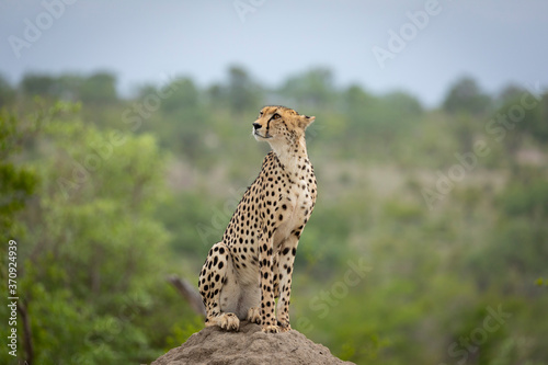 Adult cheetah sitting upright on a termite mound with green bush in background in Kruger Park