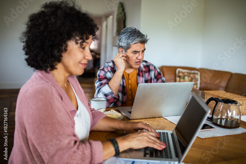 couple, adult, laptop, home, focused, concerned, budgeting, finance, kitchen table, teamwork, planning, bill, paperwork, cost of living, debt, savings, tax, home office, telecommuting, technology, communication, hot drink, mug, casual attire, morning, living room, concentration, stress, worried, spreadsheet, small business, partner, together, people, lifestyle, middle-aged, mature adult, cosy, dining table, domestic life, lifestyle, copy space