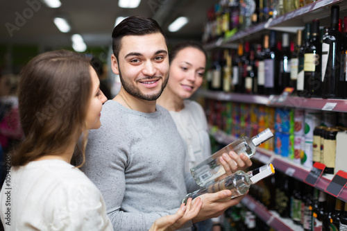 adult, client, buying, vodka, bottle, strong, alcohol, section, happy, positive, people, couple, young, girl, man, woman, casual attire, client, supermarket, caucasian, purchase, reading, choose, russian, row, product, european, unhealthy, lifestyle, shelf, sale, date, consumerism, drink, quality, buyer, beverage, wine, assortment, cognac, brandy, store, interior, indoor