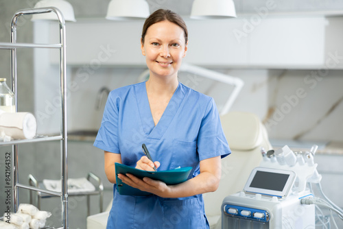 Adult female cosmetologist in medical uniform taking notes in folder in medical room