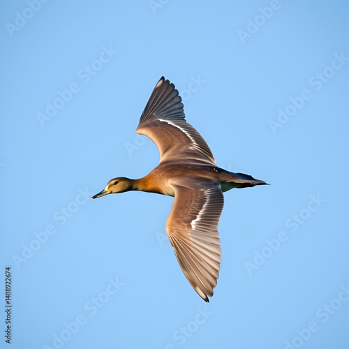 Adult female gadwall (mareca strepera) in flight against the blue sky