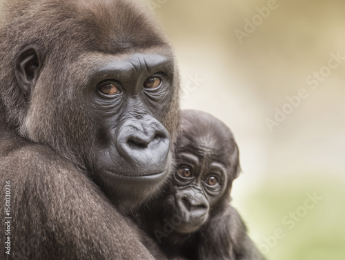 gorilla, infant, adult, holding, bond, natural, background, soft, light, brown, wildlife, animal, nature, mammal, primate, forest, zoo, care, affection, close, human relationships, family, protection, eye, expression, conservation, habitat, jungle, environment, earth, planet, ecology, endangered, species, fur, texture, emotion, wild, africa, portrait, curious, innocence, strong, protective, gentle