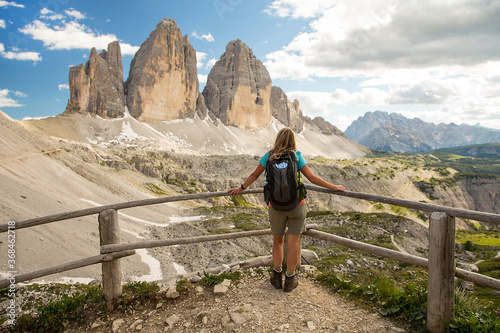 Adult hiker poses on bridge in front of Tre cime di Lavaredo - Dolomiti Alps