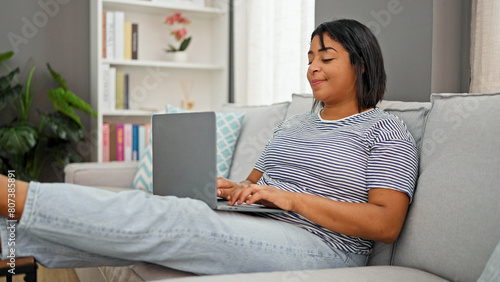 Adult hispanic woman comfortably using laptop while sitting on sofa in a home interior setting.