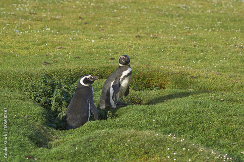 Adult Magellanic Penguin (Spheniscus magellanicus) with a nearly fully grown chick next to its burrow on the grasslands of Bleaker Island in the Falkland Islands.