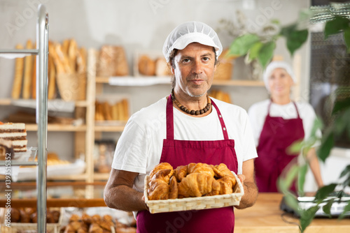 elderly, mature, adult, woman, female, man, male, 60s, 40s, caucasian, american, european, assistant, market, shop, consider, sell, seller, shelf, shopping, purchasing, food, grocery, good, retailer, product, consumerism, uniform, employee, indoor, job, work, selling, showcase, counter, bread, bakery, baked, pastry, croissant, baguette, dessert, sweet, cake, pie, cotton balls