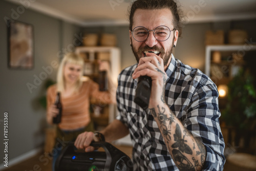 man, woman, couple, adult, karaoke, song, microphone, singing, loudspeaker, singer, party, bottle, beer, living room, home, happy, together, husband, wife, girlfriend, boyfriend, human relationships, listening, standing, beard, black hair, tattoo, eyeglass, blonde hair, blue eye, young, 2, people, drinking, alcohol, caucasian, fun, leisure, joy, female, sing, dancing, entertainment, male, celebration, lifestyle, dance, music, background
