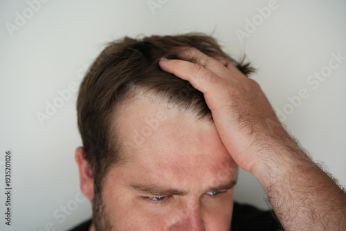 Adult man touching his head showing receding hairline and thinning hair at the temples. Close-up portrait highlighting early male pattern baldness and hair loss concern.