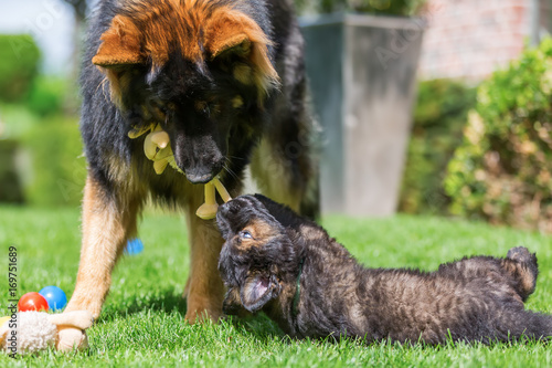 animal, black, cuddly, cute, dog, fluffy, garden, german, grass, lawn, meadow, old, pet, portrait, puppy, purebred, shepherd, adult, baby, children, fun, joy, playing, pull, soft, together, toy