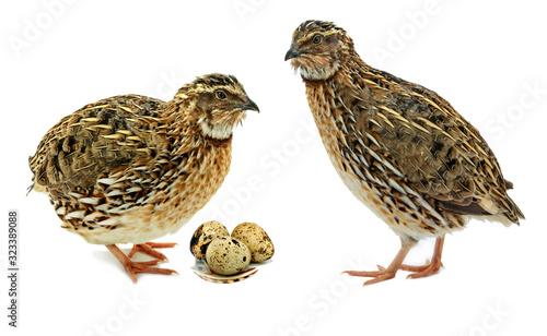 Adult quail and their eggs isolated on white background