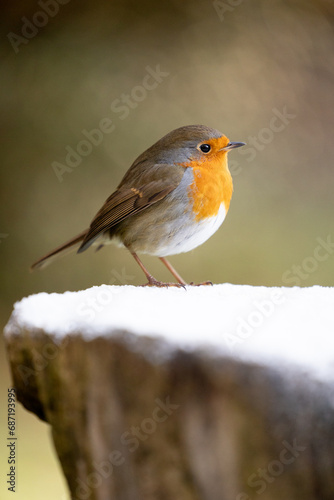 Adult Robin (erithacus rubecula) perched on a snowy log with a natural, light green, dappled background - Yorkshire, UK in Winter