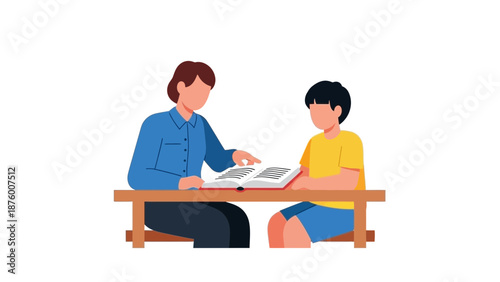 adult, children, learning, teaching, education, book, desk, sitting, indoor, cognition, studying, lesson, school, guidance, help, instruction, development, growth, understanding, information, reading, writing, homework, tutor, student, teacher, male, female, person, people, 2, together, communication, concentration, sharpened, engagement, activity, illustration, vector, graphic, simple, clean, white background, casual attire, teamwork, partnership