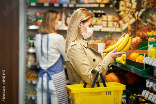 Adult woman in medical mask shopping for groceries