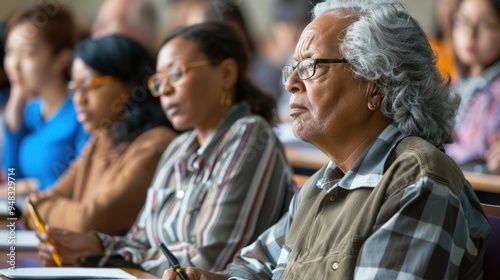 Adults listening attentively to a teacher in a traditional classroom setting, taking notes and asking questions