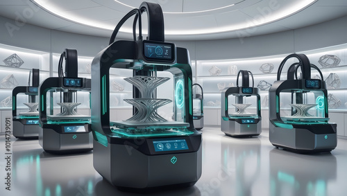 Advanced 3D Printing Process Showcased with Transparent Panels, Neon Lights, and Holographic Projections