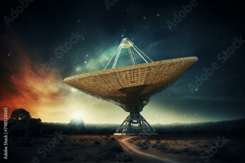 Advanced Radio telescope pointing sky at field background. Signal space science research. Generate Ai
