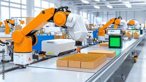 Advanced robotic arm working on an automated production line, assembling boxes in a modern manufacturing facility.