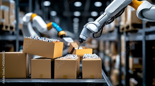 Advanced robotic technology streamlining package handling in a modern warehouse, enhancing efficiency and precision in logistics.