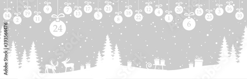 christmas, calendar, advent, christmas eve, christmas, surprise, anticipation, tension, celebration, ball, bauble, gift, present, number, merry christmas, happy new year, greeting card, greeting, winter, winterly, party, banner, panorama, hanging, nature, landscape, tree, star, moose, sled, sleigh, reindeer, snowflake, fir, ice crystals, object, symbol, motive, advertising, template, vector, illustration, background, decoration, grey